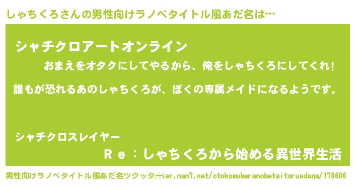 | 女子向けラノベタイトル風あだ名 | 『異世界でカフェしゃちくろを開店しました。』 |