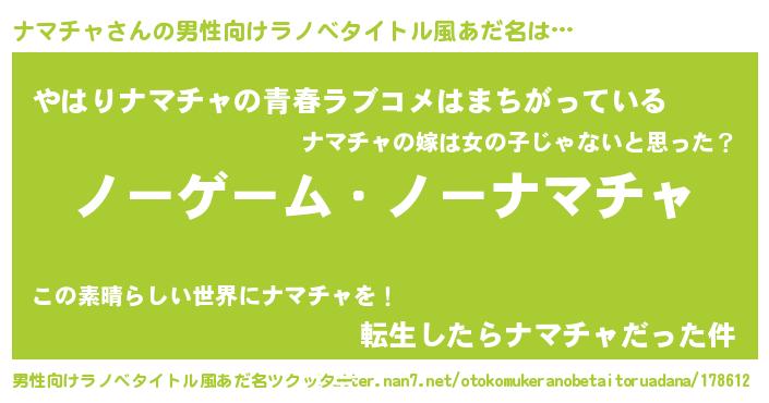 | 女子向けラノベタイトル風あだ名 | 『死神ナマチャの再婚』 |