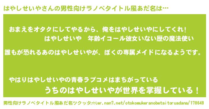 | 女子向けラノベタイトル風あだ名 | 『異世界でカフェはやしせいやを開店しました。』 |