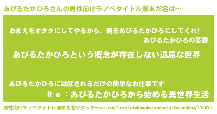 | 女子向けラノベタイトル風あだ名 | 『異世界で失敗しない100のあびるたかひろ』 |