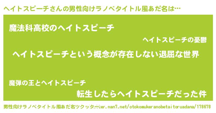 | 女子向けラノベタイトル風あだ名 | 『異世界で失敗しない100のヘイトスピーチ』 |