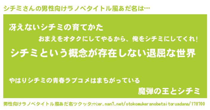 | 女子向けラノベタイトル風あだ名 | 『シチミの契約王妃』『シチミ恋絵巻』 |