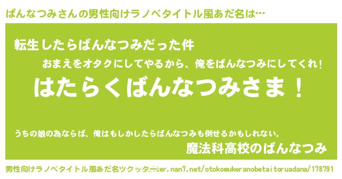 | 胡散臭い通販商品みたいなあだ名 | 『ガンによく効く高麗人参…その名も「ばんなつみ」』 |
