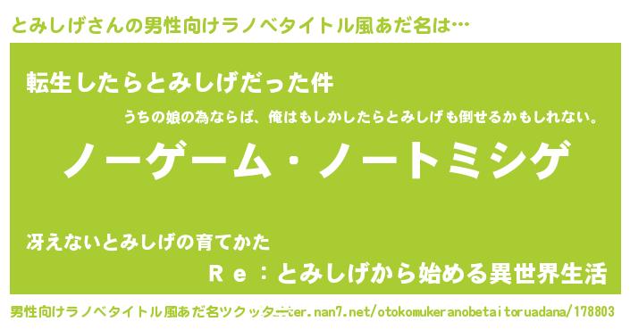 | 女子向けラノベタイトル風あだ名 | 『死神とみしげの再婚』『闇のとみしげ』 |