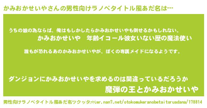 | 女子向けラノベタイトル風あだ名 | 『異世界でカフェかみおかせいやを開店しました。』 |