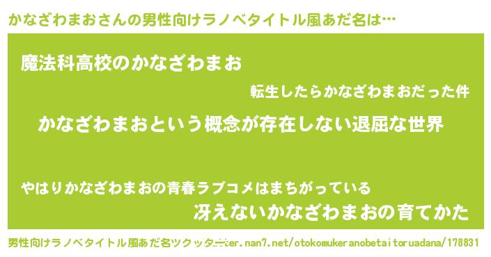 | 女子向けラノベタイトル風あだ名 | 『かなざわまおの契約王妃』 |