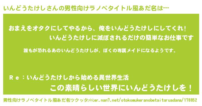 | 女子向けラノベタイトル風あだ名 | 『異世界でカフェいんどうたけしを開店しました。』 |