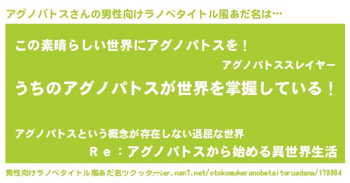 | 胡散臭い通販商品みたいなあだ名 | 『あなたにだけ特別に提供する100年もののヴィンテージワイン…その名も「アグノパトス」』 |