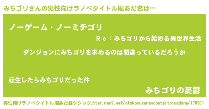 | 女子向けラノベタイトル風あだ名 | 『みちゴリの卵を拾いまして』 |