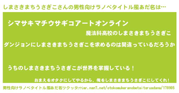 | 女子向けラノベタイトル風あだ名 | 『しまさきまちうさぎこの卵を拾いまして』 |