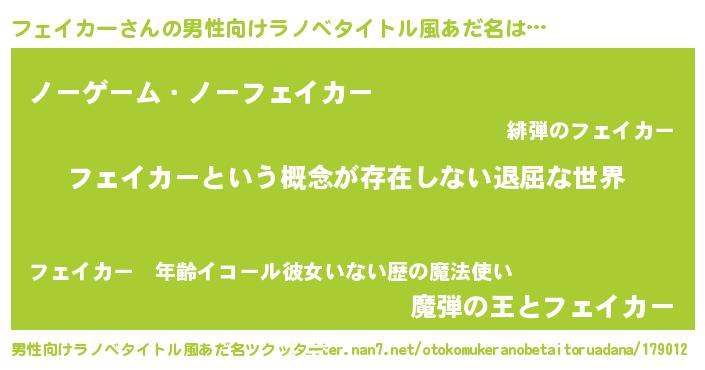 | 女子向けラノベタイトル風あだ名 | 『異世界で失敗しない100のフェイカー』 |