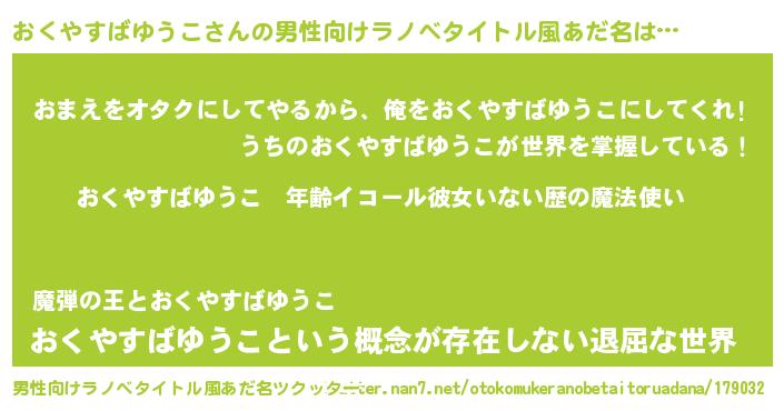| 女子向けラノベタイトル風あだ名 | 『おくやすばゆうこの玉の輿計画!』 |