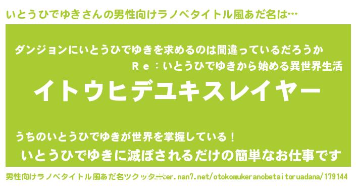 | 女子向けラノベタイトル風あだ名 | 『婚約破棄系悪役いとうひでゆきに転生したので、保身に走りました。』 |