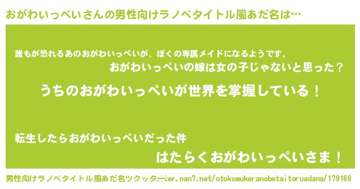 | 女子向けラノベタイトル風あだ名 | 『男装おがわいっぺいの憂鬱な任務』 |