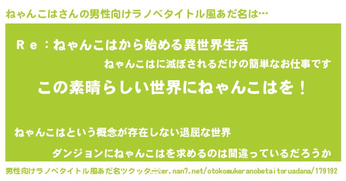 | 女子向けラノベタイトル風あだ名 | 『悪役ねゃんこはに転生したようですが、知った事ではありません』 |