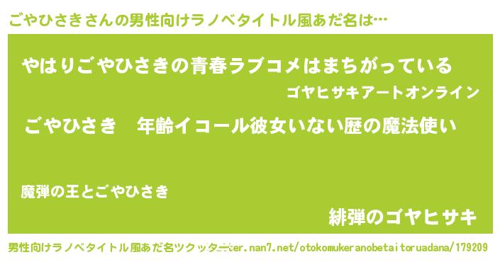 | 女子向けラノベタイトル風あだ名 | 『ごやひさきの玉の輿計画!』 |