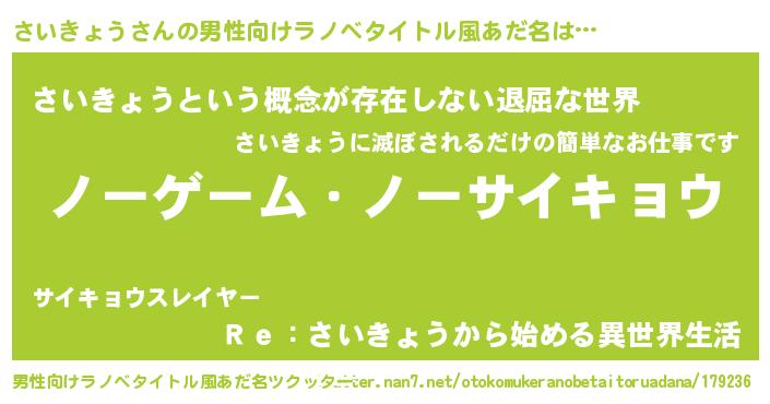| 女子向けラノベタイトル風あだ名 | 『さいきょう恋絵巻』『闇のさいきょう』 |