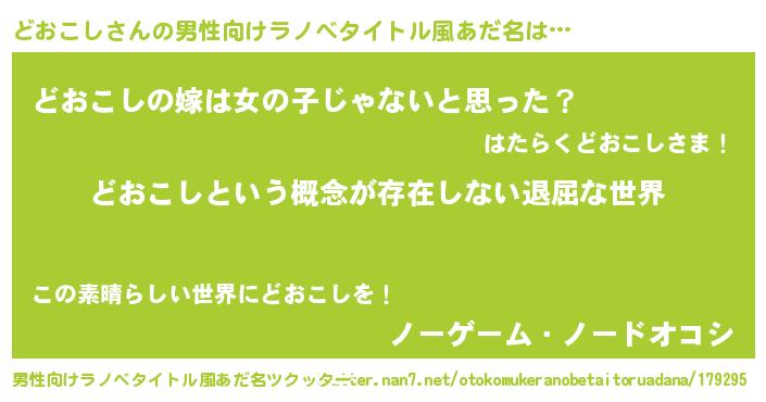 | 女子向けラノベタイトル風あだ名 | 『異世界で失敗しない100のどおこし』 |