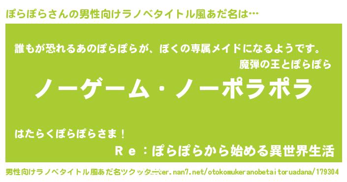 | 女子向けラノベタイトル風あだ名 | 『死神ぽらぽらの再婚』『闇のぽらぽら』 |