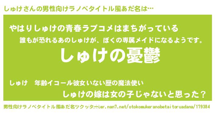 | 女子向けラノベタイトル風あだ名 | 『(仮)しゅけのやんごとなき事情』 |