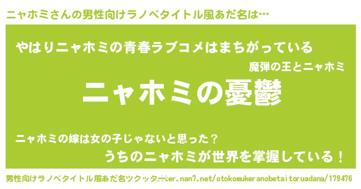 | 女子向けラノベタイトル風あだ名 | 『(仮)ニャホミのやんごとなき事情』 |