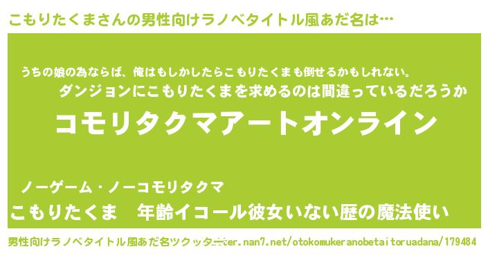| 胡散臭い通販商品みたいなあだ名 | 『億万長者になれる霊験あらたかなお札…その名も「こもりたくま」』 |