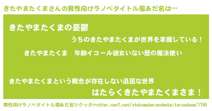 | 女子向けラノベタイトル風あだ名 | 『きたやまたくまの玉の輿計画!』 |