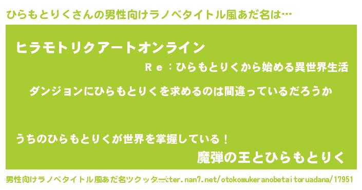 | 胡散臭い通販商品みたいなあだ名 | 『信頼と実績のサプリメント…その名も「ひらもとりく」』 |