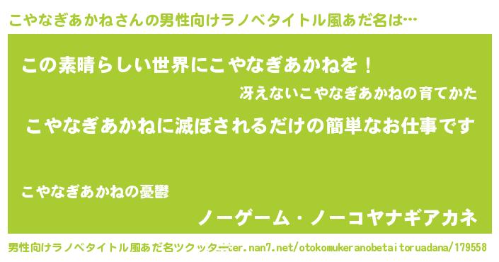 | 胡散臭い通販商品みたいなあだ名 | 『あなたにだけ特別に提供する100年もののヴィンテージワイン…その名も「こやなぎあかね」』 |