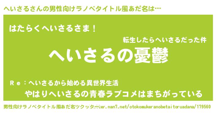 | 女子向けラノベタイトル風あだ名 | 『(仮)へいさるのやんごとなき事情』 |