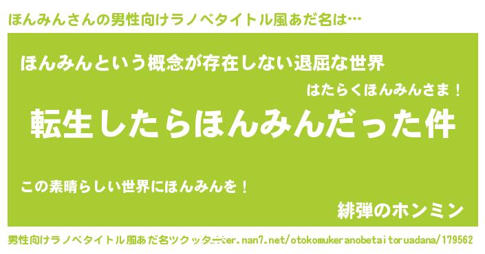 | 胡散臭い通販商品みたいなあだ名 | 『来世でも幸せになれる水素水…その名も「ほんみん」』 |