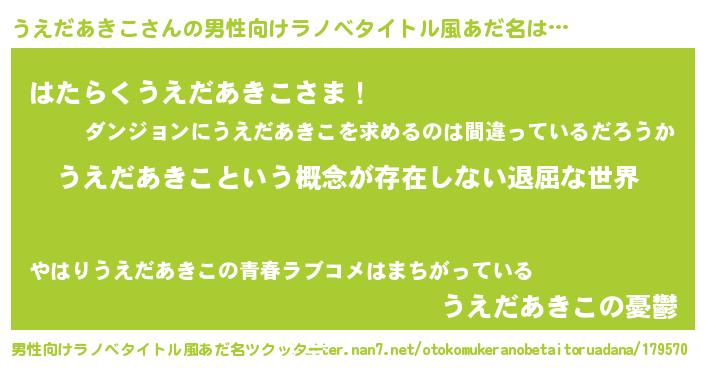 | 女子向けラノベタイトル風あだ名 | 『異世界で失敗しない100のうえだあきこ』 |