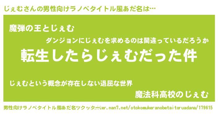 | 胡散臭い通販商品みたいなあだ名 | 『世界中を虜にした100年もののヴィンテージワイン…その名も「じぇむ」』 |