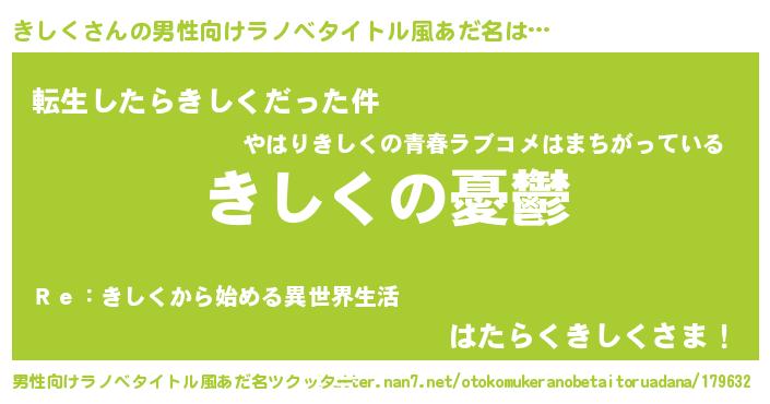 | 女子向けラノベタイトル風あだ名 | 『きしく姫と円卓の騎士』『闇のきしく』 |