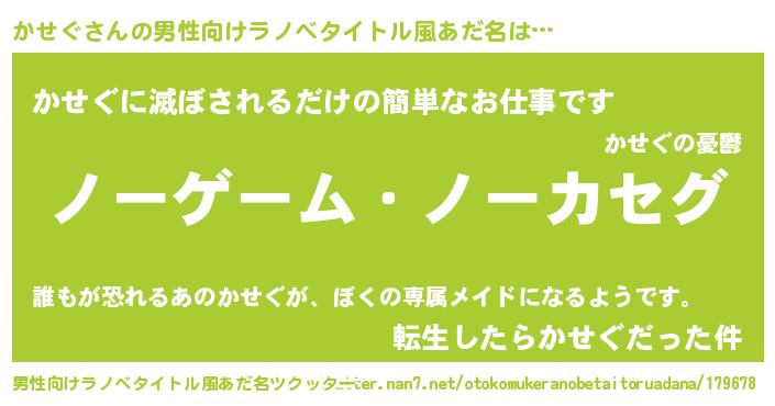 | 女子向けラノベタイトル風あだ名 | 『死神かせぐの再婚』 |