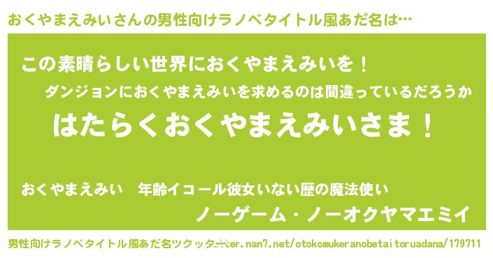 | 胡散臭い通販商品みたいなあだ名 | 『ハリウッド女優が絶賛した100年もののヴィンテージワイン…その名も「おくやまえみい」』 |