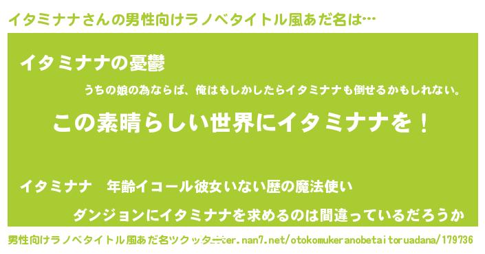 | 胡散臭い通販商品みたいなあだ名 | 『あなたにだけ特別に提供する限定10本のレアな日本酒…その名も「イタミナナ」』 |