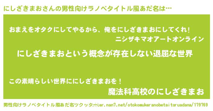 | 女子向けラノベタイトル風あだ名 | 『異世界で失敗しない100のにしざきまお』 |