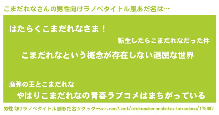| 胡散臭い通販商品みたいなあだ名 | 『絶対に幸福をもたらす健康食品…その名も「こまだれな」』 |