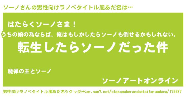 | 女子向けラノベタイトル風あだ名 | 『婚約破棄系悪役ソーノに転生したので、保身に走りました。』 |