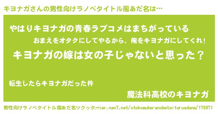 | 女子向けラノベタイトル風あだ名 | 『キヨナガの卵を拾いまして』 |