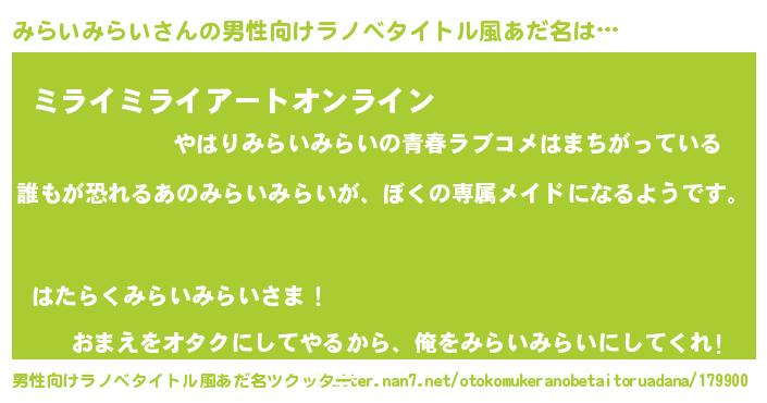 | 女子向けラノベタイトル風あだ名 | 『異世界でカフェみらいみらいを開店しました。』 |