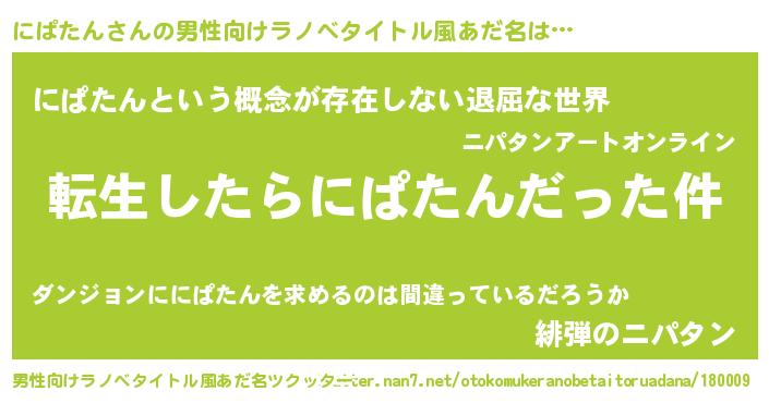 | 女子向けラノベタイトル風あだ名 | 『にぱたんの玉の輿計画!』 |