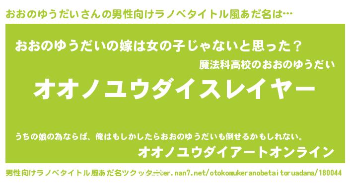 | 胡散臭い通販商品みたいなあだ名 | 『信頼と実績のサプリメント…その名も「おおのゆうだい」』 |
