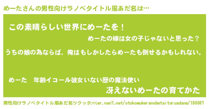 | 女子向けラノベタイトル風あだ名 | 『めーた伯爵の花嫁』『めーた様がみてる』 |
