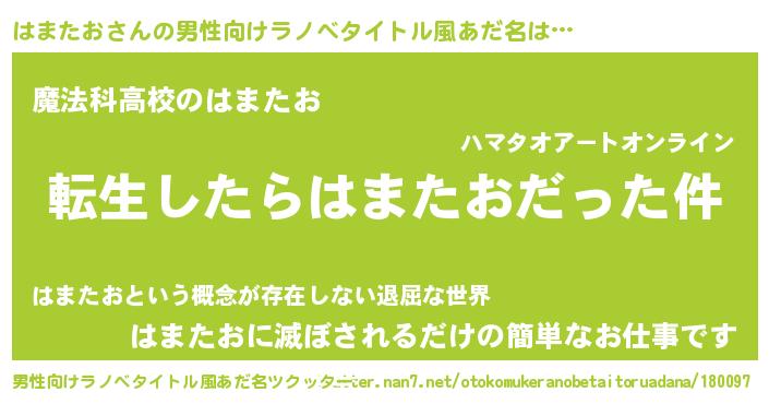 | 女子向けラノベタイトル風あだ名 | 『はまたおの玉の輿計画!』 |