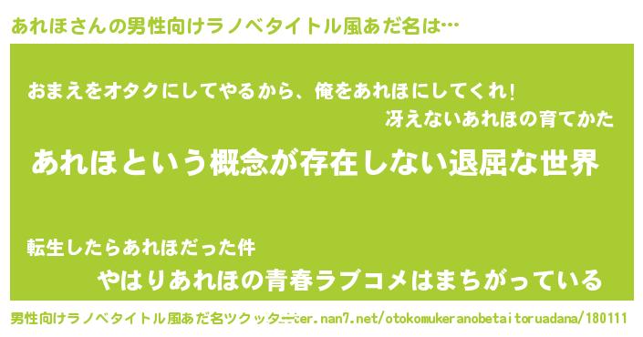 | 胡散臭い通販商品みたいなあだ名 | 『絶対に幸福をもたらす水素水…その名も「あれほ」』 |