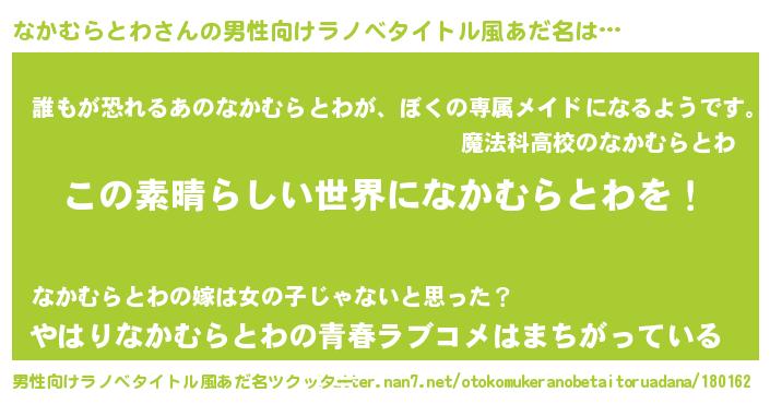 | 女子向けラノベタイトル風あだ名 | 『悪役なかむらとわに転生したようですが、知った事ではありません』 |