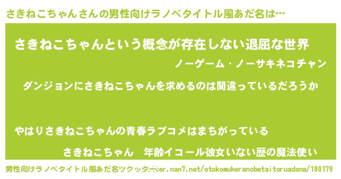 | 胡散臭い通販商品みたいなあだ名 | 『伝統あるサプリメント…その名も「さきねこちゃん」』 |