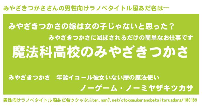 | 女子向けラノベタイトル風あだ名 | 『みやざきつかさなんてお断りですっ。』 |